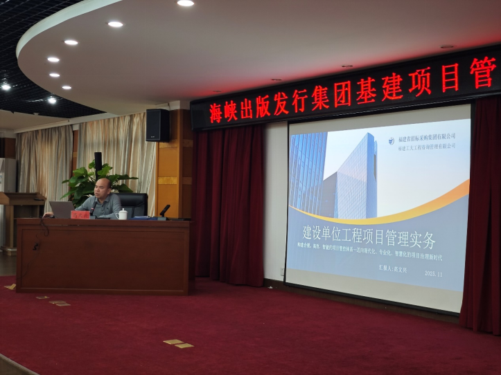 11月26日下午,海峡出版发行集团精心组织基建项目管理专题培训活动,以提升集团基建项目管理团队的专业素养与风险防控能力。福建省招标股份有限公司权属企业——福建工大工程咨询管理有限公司,凭借在全过程工程咨询领域的深厚积淀与专业实力,受邀为此次培训提供支持。公司技术负责人高文兴以《建设单位工程项目管理实务——构建合规、高效、智能的项目风险防控体系》为题,为培训班带来一场兼具理论深度与实操价值的专题分享。