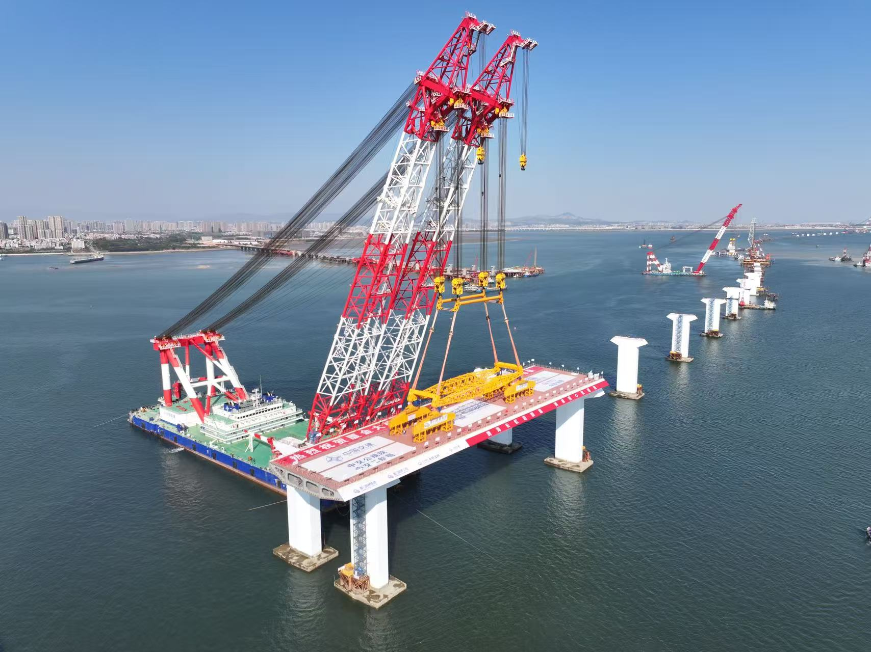 12月29日,在国内最大双臂架变幅式起重船“二航卓越”号的精准操作下,重达3857.1吨的钢箱梁以低于2毫米的误差,平稳架设在厦金大桥(厦门段)A2标段欧厝互通主线桥的两个桥墩之间,此次吊装实现了国内单台浮吊完成最长、最重钢箱梁安装,厦金大桥(厦门段)的上部构造施工迈入高速推进的阶段。