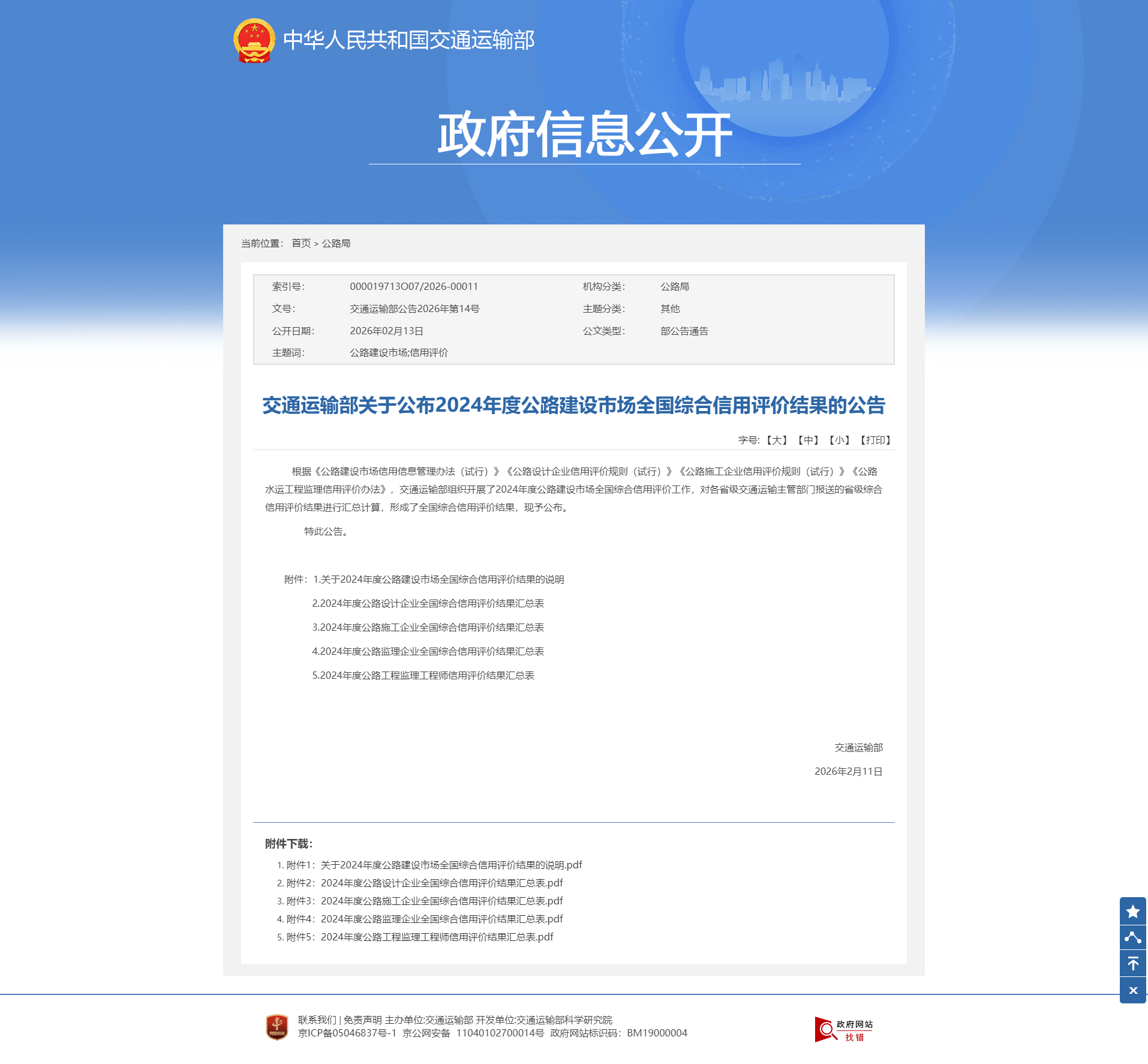 2026年2月11日,交通运输部公布2024年度公路建设市场全国综合信用评价结果,福建省招标采购集团权属企业——福建省交通建设工程监理咨询有限公司再度斩获公路监理企业全国综合信用评价最高等级——AA级!