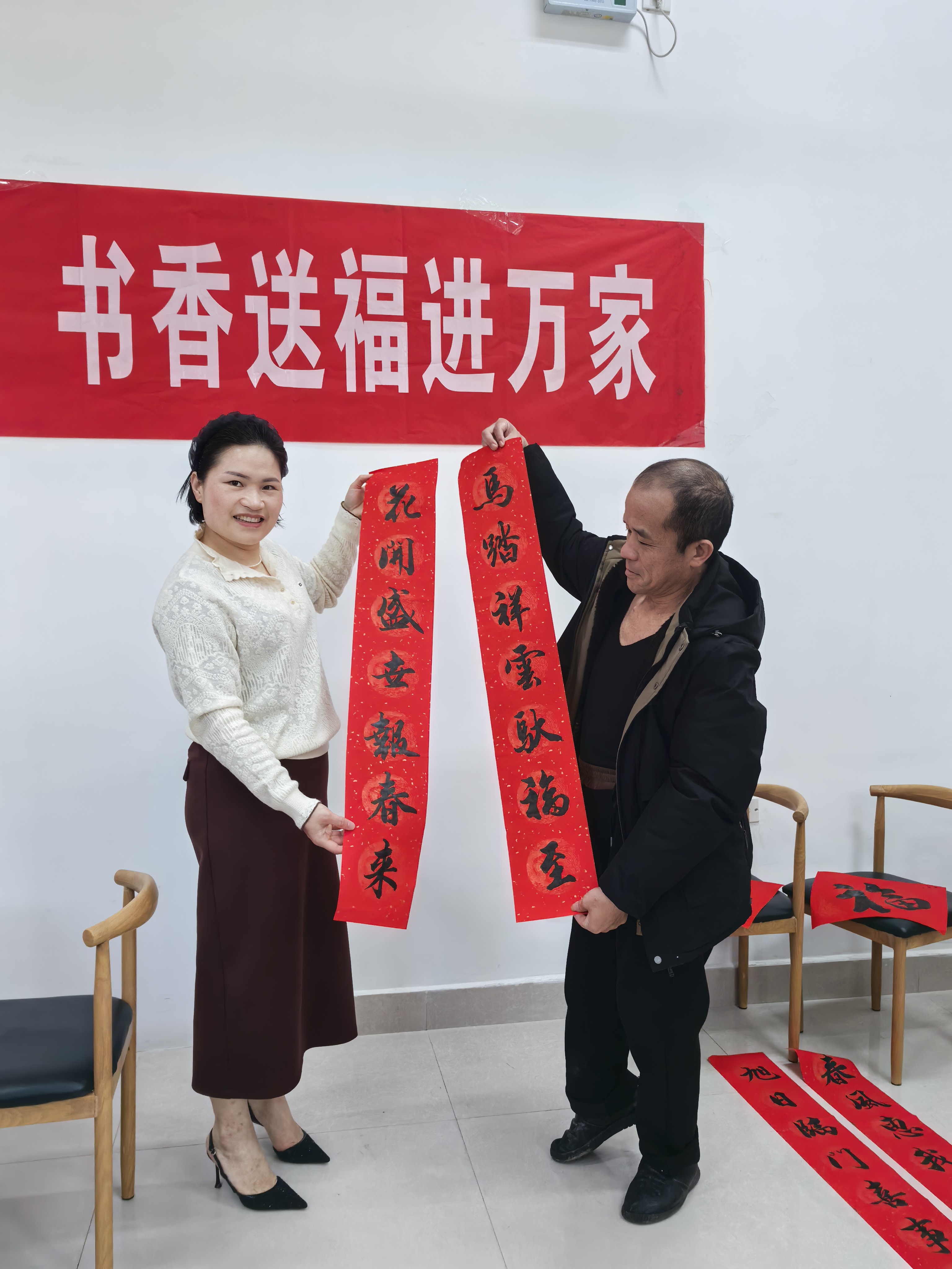 活动现场,“志愿红”身影与红艳的春联、“福”字相映成趣,成为冬日里一道温暖的风景。 党员志愿者们各展所长、默契配合,有的伏案提笔,全神贯注地将美好祝愿凝于笔端;有的在一旁悉心研墨、铺展红纸;有的则热情协助居民挑选寓意吉祥的联句;还有的穿梭其间,亲切地维持着现场欢乐而有序的氛围 ,展现出基层党组织的凝聚力和行动力。