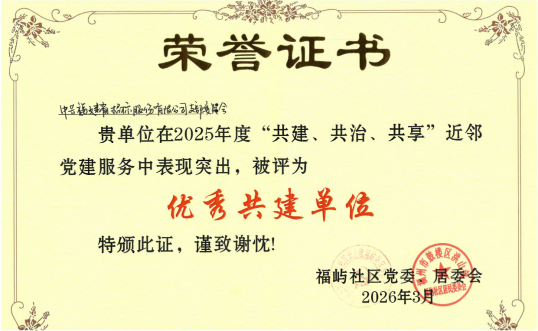 近日,招标股份党支部获所在辖区福屿社区党委、居委会联合授予的“优秀共建单位”荣誉称号,这是对支部长期以来积极投身社区共建、扎实开展基层群众服务工作的充分肯定与高度认可。